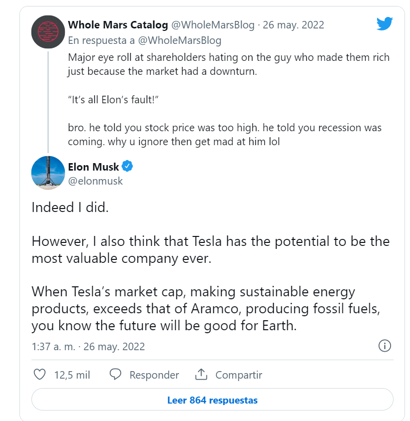No, Tesla’s main rival is one of the world’s largest gas companies. Aramco had a market capitalization of $2.431 billion in May 2022. Tesla, which today is the automaker with the highest stock market value is worth $786 billion, and has reached $1 billion at its time in May value. In any case, the gap between the two companies is still very large.